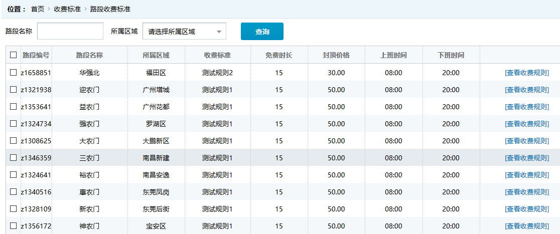 ●路段收費標準:根據(jù)系統(tǒng)添加的路段,對應(yīng)的收費標準記錄,可點擊“查看收費規(guī)則”了解收費標準的明細,每個路段可以執(zhí)行不同的收費規(guī)則。