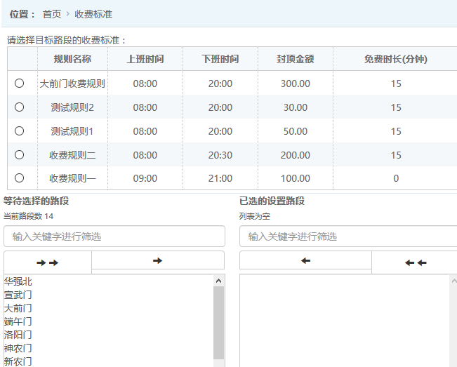 ●添加收費規(guī)則:在列表中可選中指定的收費標準,對應(yīng)到多個路段中,如圖: