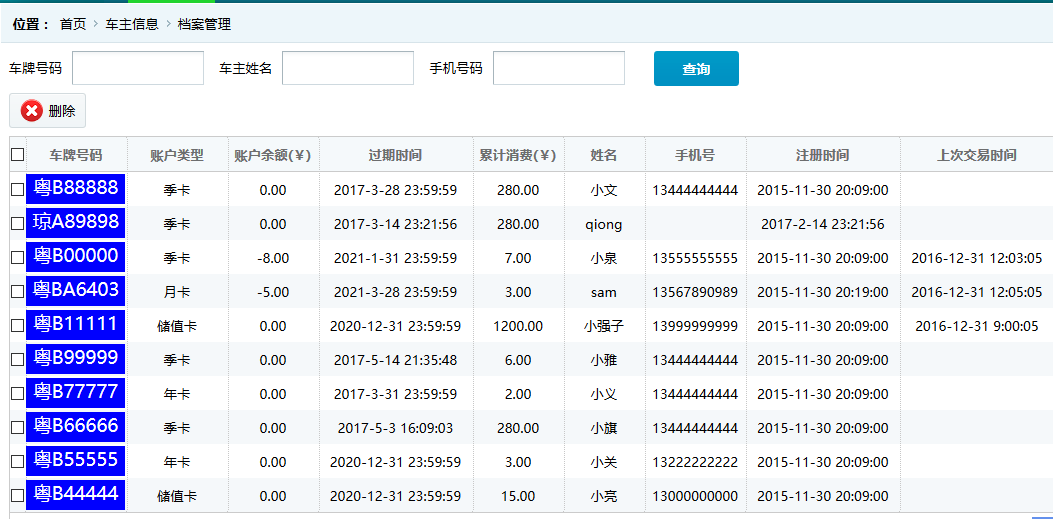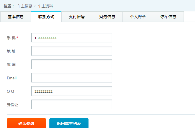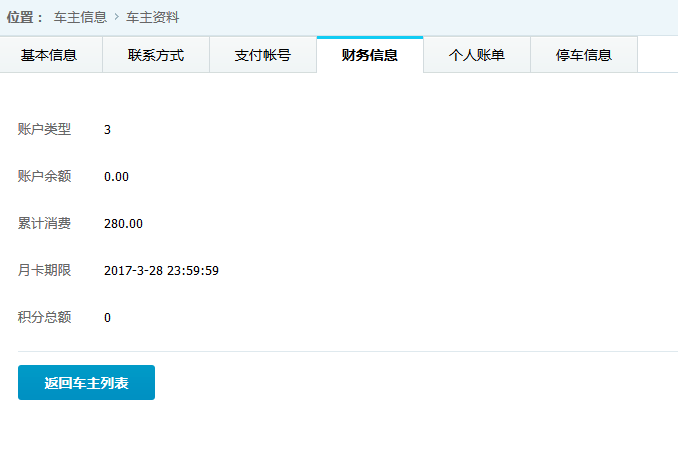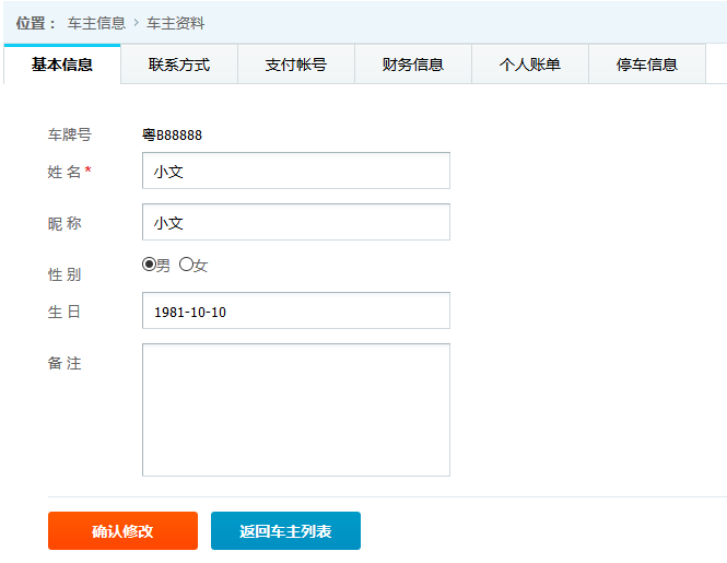 ●車主詳細信息 查看并維護車主的基本信息,旭歐科技系統(tǒng)中自動為進場停車的車輛建立會員賬戶,方便交費充值等服務(wù)。在此功能中,管理員可對車主詳細信息查看并修改,如下圖: