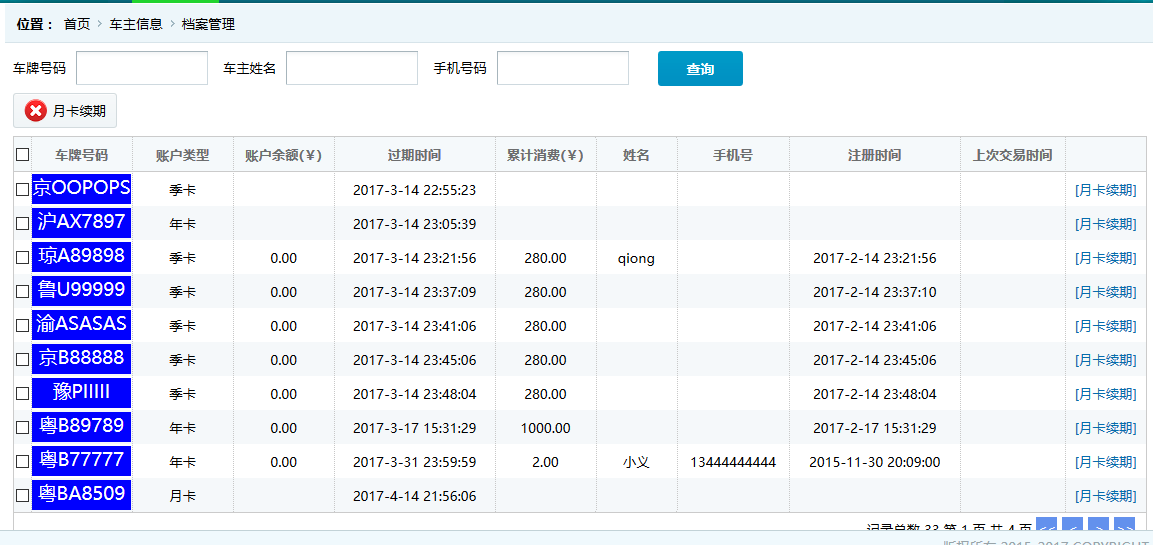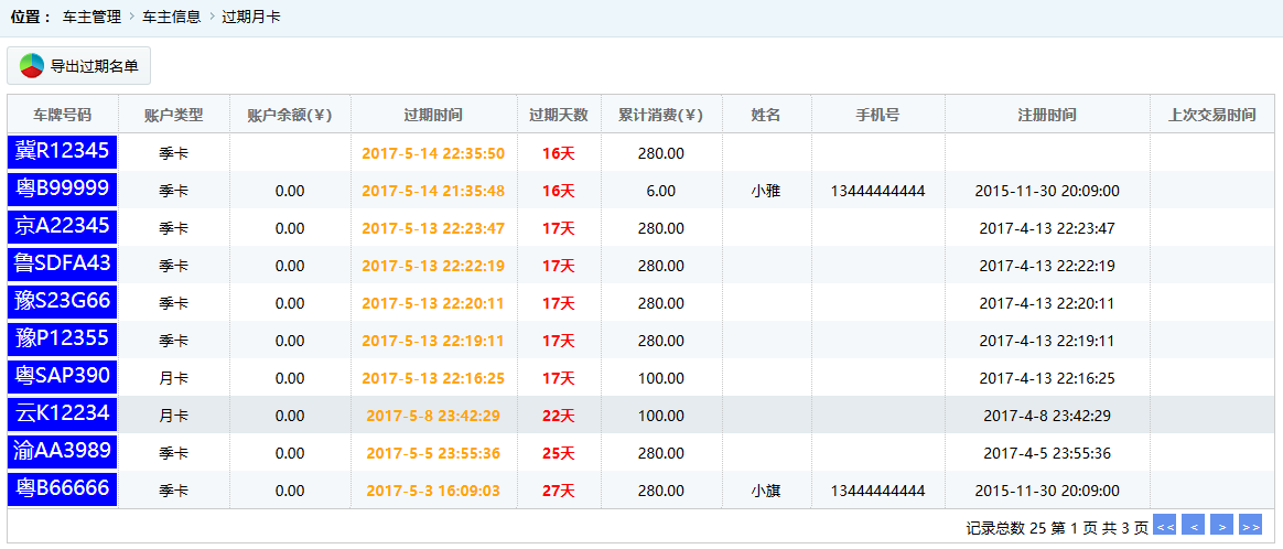 ●到期提醒 顯示月卡車主中離到期時間小于30天的賬戶信息,如圖: